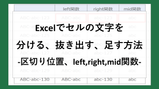 Excelでセルの文字列を分ける、抜き出す、足す方法を紹介しています。区切り位置やleft関数、right関数、mid関数を使った方法です。